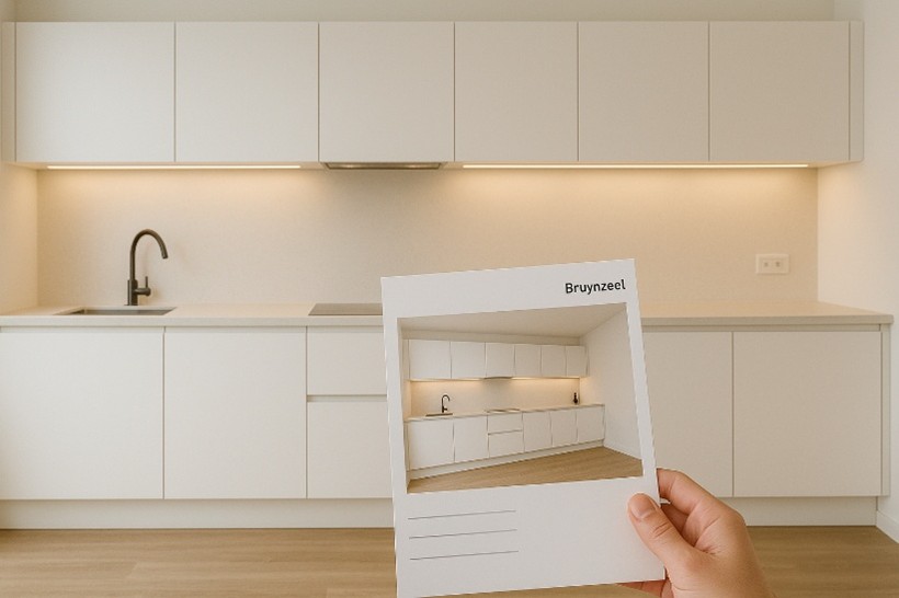 De foto op deze pagina toont een ultra realistische moderne keuken met lichte kleuren en een overzichtelijke indeling. De camera is gericht op een ontwerpkaart in de voorgrond die aansluit op de keukenopstelling in dezelfde ruimte. Slanke fronten, een mat werkblad en rustige lijnen laten zien hoe een ontwerp en een concreet plan samen kunnen worden bekeken. De warme verlichting benadrukt de sfeer die ontstaat wanneer materiaal en indeling goed op elkaar zijn afgestemd. Deze afbeelding maakt zichtbaar hoe bezoekers hun ontwerpidee kunnen vertalen naar een praktische en haalbare oplossing. Voor meer inspiratie verwijzen we naar onze interne pagina over keukenindelingen.